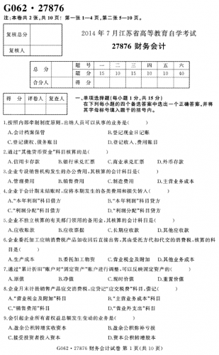 自考《27876财务会计》(江苏)2014年7月真题【原版扫描】